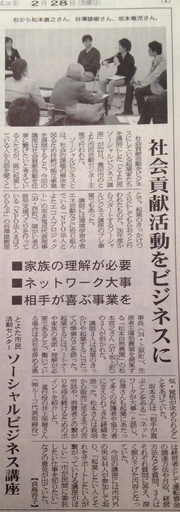 2014年02月28日(金) メディア掲載 < BLOG 2014.02.28 「矢作新報」掲載:代表 井上がコーディネーターを務めた「とよた流ソーシャルビジネス講座」について 2014.02.28 「矢作新報」掲載:代表 井上がコーディネーターを務めた「とよた流ソーシャルビジネス講座」について